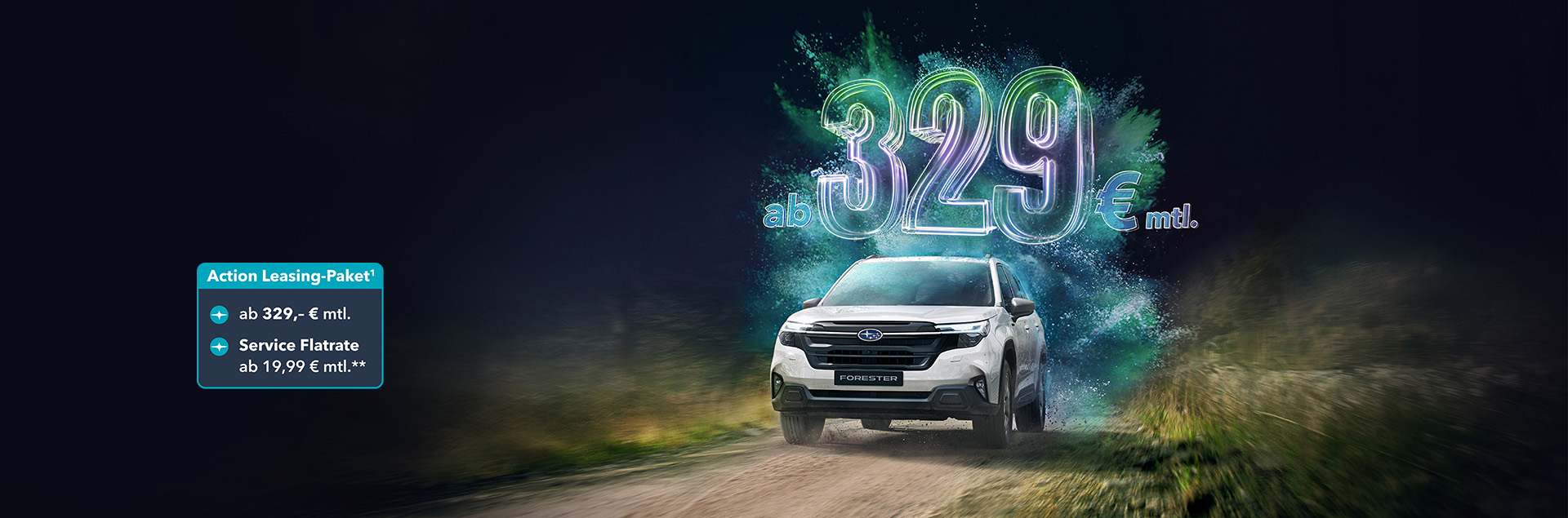 1 Die Aktion gilt vom 01.04.2026 bis 30.06.2026 in Verbindung mit dem Leasing eines aktuellen Subaru Forester (Modelljahr 2025/2026) (Neu- oder Vorführwagen), Zulassung / Besitzumschreibung bis 31.12.2026 bei teilnehmenden Subaru Partnern. Die Aktion wird von der SUBARU Deutschland GmbH getragen und ist nicht mit anderen Aktionen der SUBARU Deutschland GmbH kombinierbar mit Ausnahme des Aktionsangebots zur Service-Flatrate. Weitere Detailinformationen erhalten Sie bei Ihrem teilnehmenden Subaru-Partner oder unter www.subaru.de. Musterrechnung: Subaru Forester MJ26 Exclusive Leasingbeispiel (gültig bis 30.06.2026): Anzahlung 0,00 EUR, monatliche Rate 329 EUR, Laufzeit 36 Monate, Laufleistung p. a. 10000 km, zzgl. Überführungskosten 990 EUR, Gesamtpreis (inkl. Überführungskosten) 12834 EUR. Ein Freibleibendes Leasingangebot der SUBARU Finance, ein Service der MCE Bank GmbH, Schieferstein 9, 65439 Flörsheim. Alle Preise verstehen sich inkl. Umsatzsteuer.